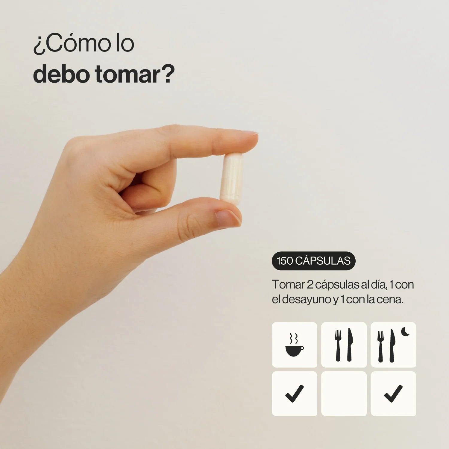 Tomar 2 cápsulas al día, 1 con el desayuno y 1 con la cena.