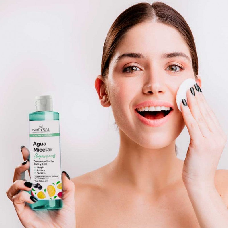 Agua Micelar enriquecida con Goji, Acai, Maqui, Higo Chumbo y Moringa: potentes antioxidantes, que además nutren y protegen la piel de daños como los producidos por agentes contaminantes. Ricos en vitaminas y minerales. Apta para todo tipo de pieles, limpia, purifica y tonifica el rostro a la vez que desmaquilla cara y ojos.