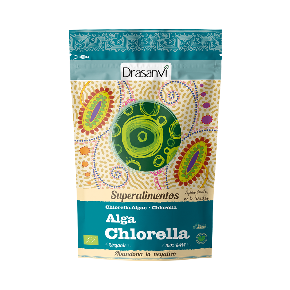 El Alga Chlorella es un alga unicelular pero su pequeño tamaño no va relacionado con su interesante valor nutricional. Es rica en proteínas, lo que supone una excelente fuente de Aminoácidos, vitaminas (Ácido Pantoténico, Ácido Fólico, Biotina, Vitamina B2 y B12) y minerales (Hierro, Zinc y Fósforo). El Alga Chlorella se recoge en aguas claras y certificando la ausencia de sustancias contaminantes. Una vez recolectada, se rompen su paredes celulares para que las proteínas, vitaminas y minerales sean más accesibles. Ideal para la elaboración de zumos y batidos. Recomendado para deportistas.