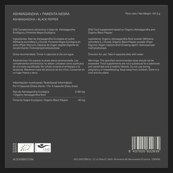 Aumenta tu energía y tu deseo sexual con la Ashwagandha con Pimienta Negra Aldous Bio ecológica. Un extracto de raíz de ashwagandha de la India con pimienta negra presentado en 250 cápsulas para más de dos meses.