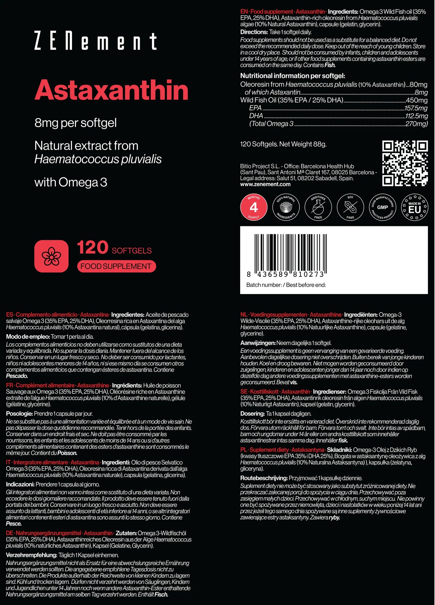 Contenido por dosis (1 cápsula blanda): Oleorresina de Haematococcus pluvialis (10% Astaxantina) 80 mg, de los cuales Astaxantina 8 mg, Aceite de pescado salvaje (35% EPA / 25% DHA) 450 mg, EPA 157,5 mg, DHA 112,5 mg, (Total Omega 3 270 mg). Otros ingredientes: cápsula blanda (gelatina bovina, glicerol).