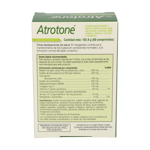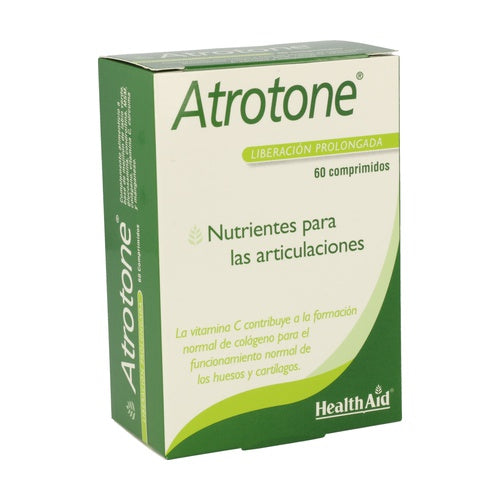 Atrotone de Health Aid es un complemento alimenticio a base de glucosamina, condroitina, cúrcuma, MSM, vitamina C, manganeso y colágeno.