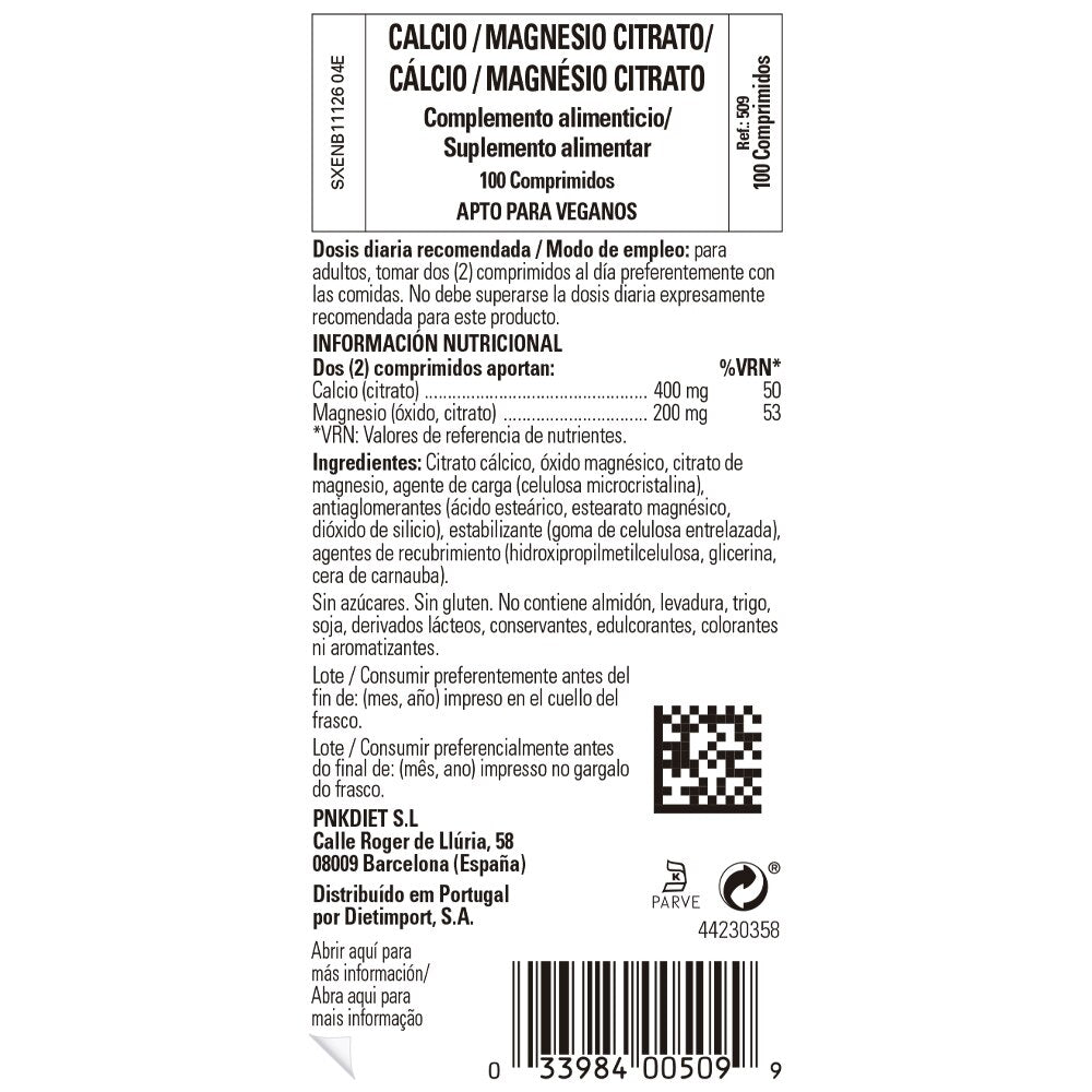 Citrato cálcico, óxido magnésico, citrato de magnesio, agente de carga (celulosa microcristalina), antiaglomerantes (ácido esteárico, estearato magnésico, dióxido de silicio), estabilizante (goma de celulosa entrelazada), agentes de recubrimiento (hidroxipropilmetilcelulosa, glicerina, cera de carnauba).