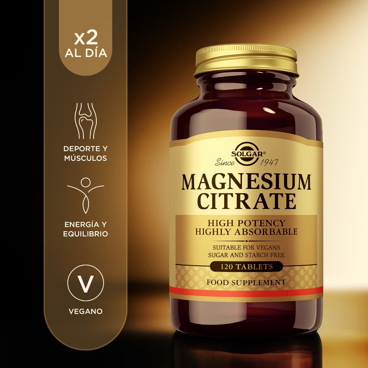 Magnesio orgánico en forma de citrato, de fácil absorción y alta concentración por comprimido, que contribuye al mantenimiento del sistema musculoesquelético.