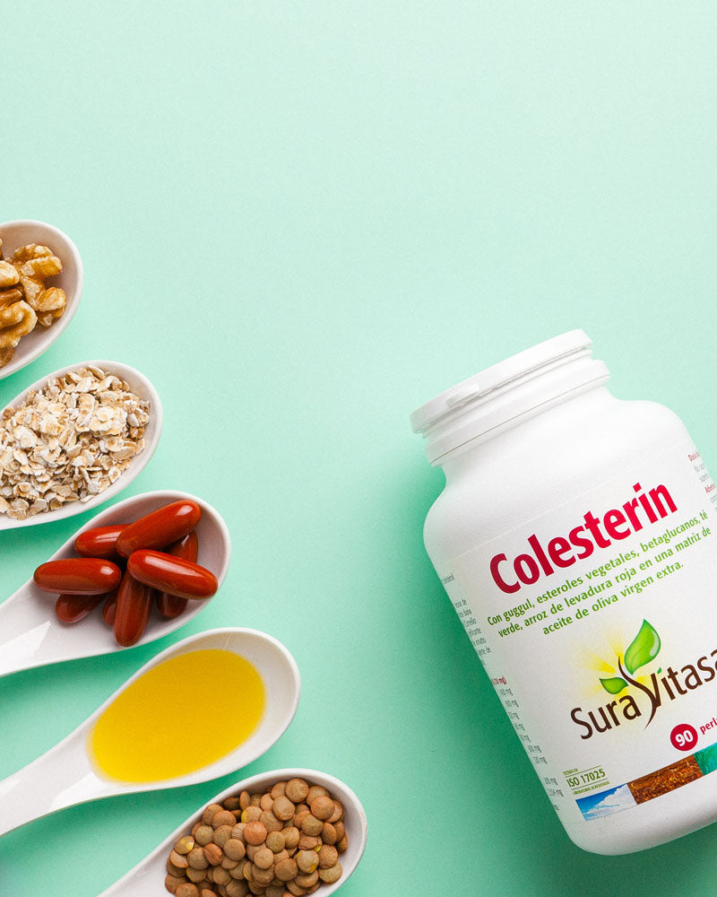 Colesterin es una fórmula sinérgica compuesta por ingredientes naturales: guggul, esteroles vegetales (fitosteroles), avena, té verde, arroz de levadura roja formulados en una matriz altamente biodisponible de aceite de oliva virgen extra.