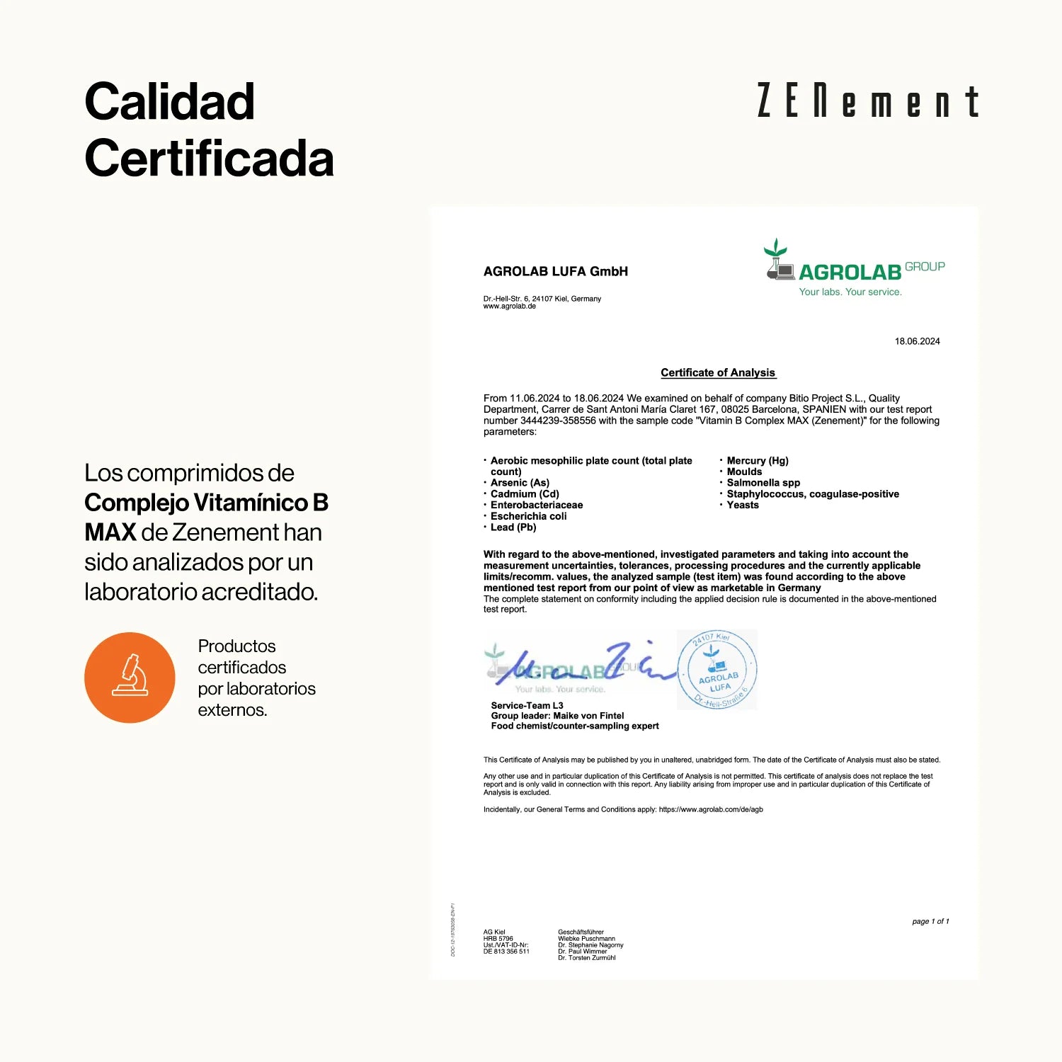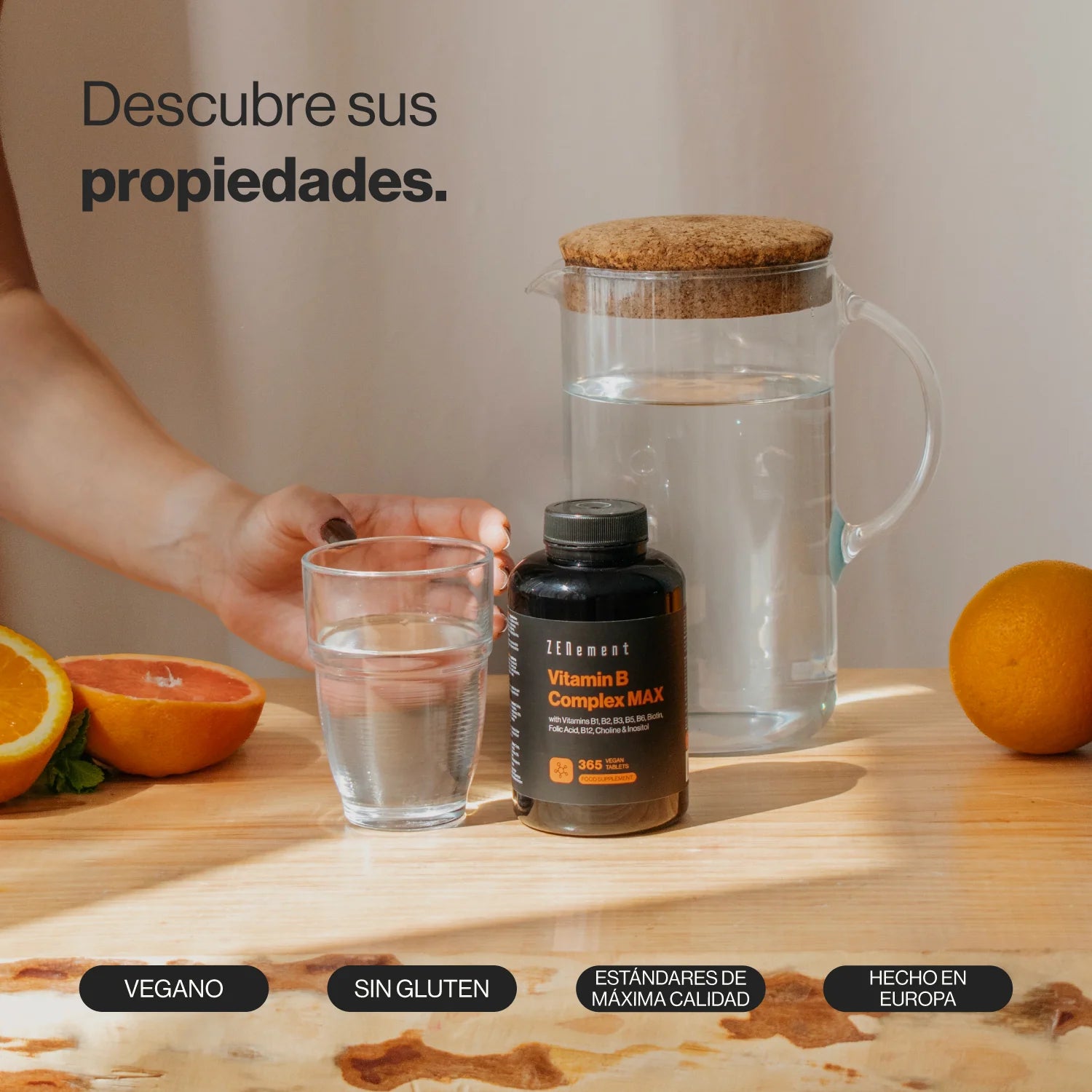 Ingredientes por comprimido: Vitamina B1 (como Clorhidrato de Tiamina) 1,65 mg (150% VRN*), Vitamina B2 (como Riboflavina) 2,1 mg (150% VRN*), Vitamina B3 (como Nicotinamida) 24 mg (150% VRN*), Vitamina B5 (como Calcio D-Pantotenato) 9 mg (150% VRN*), Vitamina B6 (como Clorhidrato de Piridoxina) 2,1 mg (150% VRN*), Biotina (como Vitamina B7/8, D-Biotina) 150 µg (300% VRN*), Ácido Fólico (como Vitamina B9, Ácido pteroilmonoglutámico) 300 µg (150% VRN*), Vitamina B12 (como Metilcobalamina) 7,5 µg (300% VRN*), Colina (como Bitartrato de Colina) 82,5 mg, Mioinositol 75 mg. Otros ingredientes: agentes de carga (celulosa microcristalina, fosfato dicálcico), antiaglomerante (almidón de arroz). * VRN: Valor de Referencia de Nutrientes.