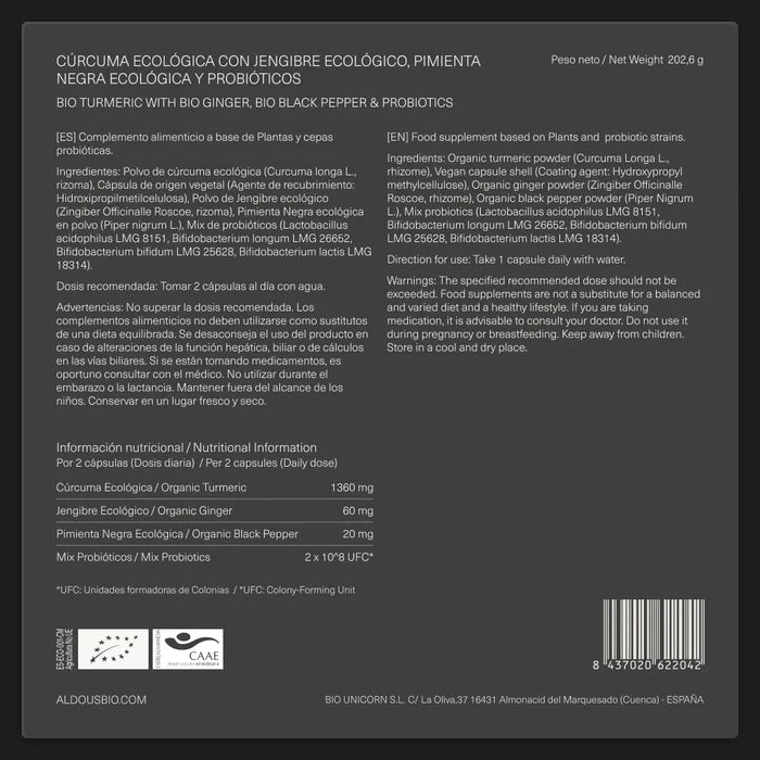 Reduce la inflamación abdominal y articular con la Cúrcuma con Jengibre, Pimienta Negra y Probióticos Aldous Bio. Una formulación avanzada con probióticos presentada en 250 cápsulas ecológicas para 125 días.
