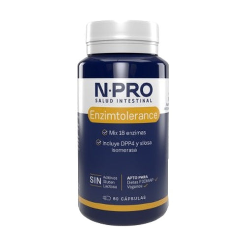 NPRO Enzimtolerance es una innovadora formulación que ayuda a paliar el déficit de enzimas digestivas relacionadas con las intolerancias alimenticias, las hipersensibilidades a gluten, caseína u otras proteínas, la digestión de las grasas, y la descomposición de antinutrientes presentes en cereales, frutos secos, semillas o legumbres. Complemento para la dieta baja en FODMAP en SIBO o SII, y de apoyo en casos como úlceras digestivas, gastritis, hiperclorhidria o por uso habitual de protectores gástricos.