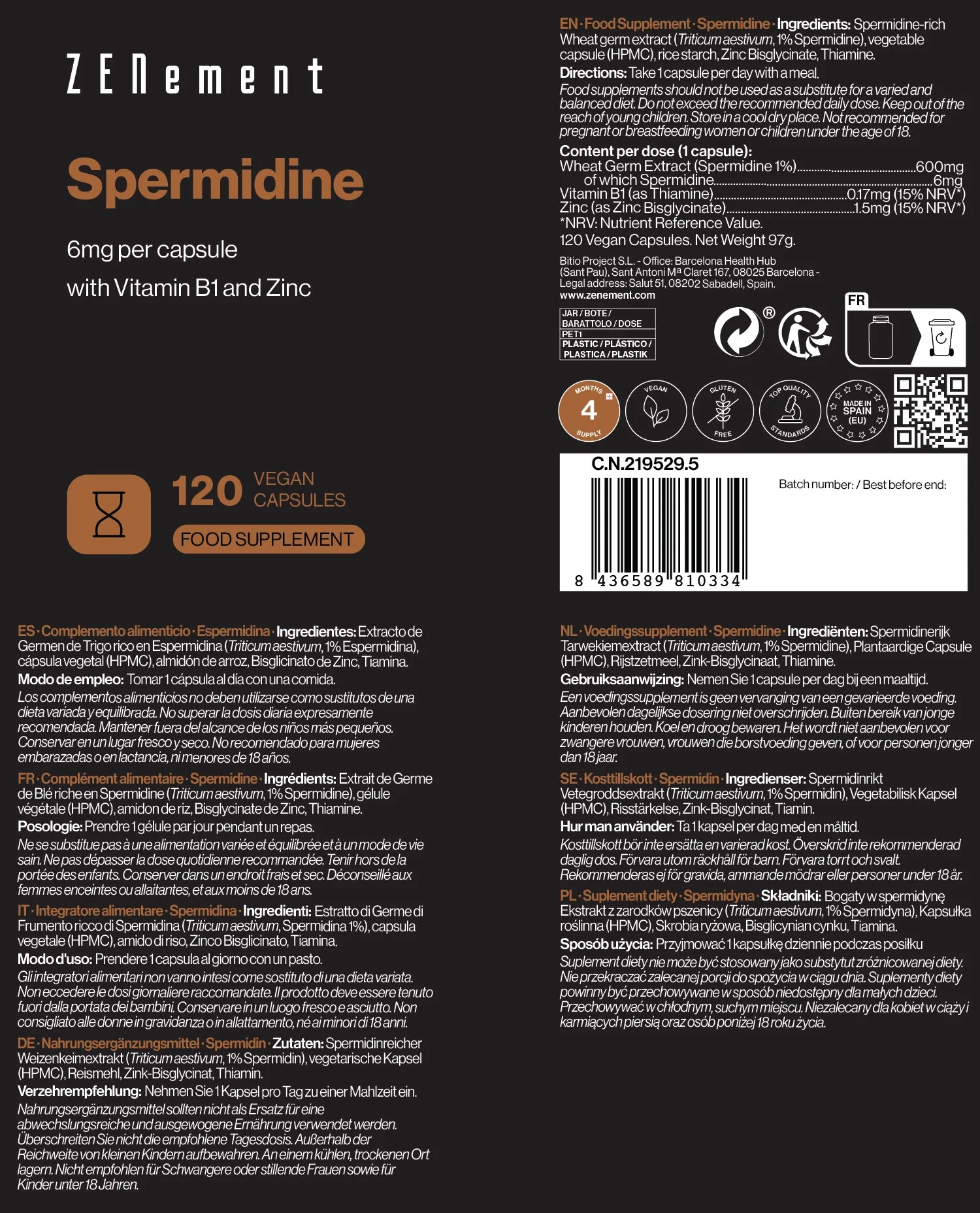 Contenido por dosis (1 cápsula): Extracto de Germen de Trigo rico en Espermidina (Espermidina 1%) 600 mg, de los cuales Espermidina 6 mg, Vitamina B1 (como Tiamina) 0,17 mg (15% VRN*), Zinc (como Bisglicinato de Zinc) 1,5 mg (15% VRN*). Otros ingredientes: almidón de arroz, cápsula vegetal (HPMC).