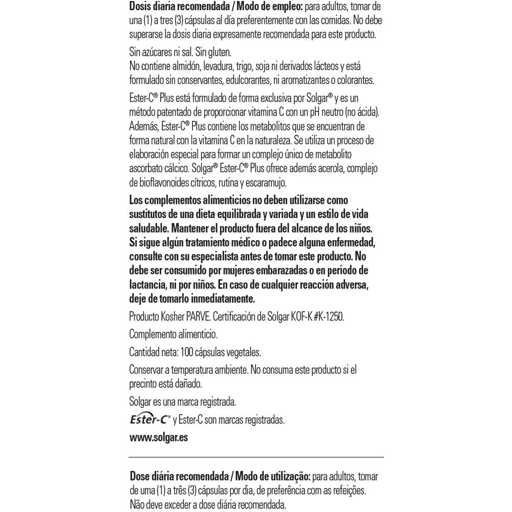 Ester-C® Plus está formulado de forma exclusiva por Solgar® y proporciona una vitamina C ampliamente investigada con un pH neutro (no ácida). Además, Ester-C® Plus contiene los metabolitos que se encuentran de forma natural con la vitamina C en la naturaleza. Se utiliza un proceso de elaboración especial para formar un complejo único de metabolito ascorbato cálcico. Por su caracter no ácido, es mejor tolerada que otras presentaciones de vitamina C.