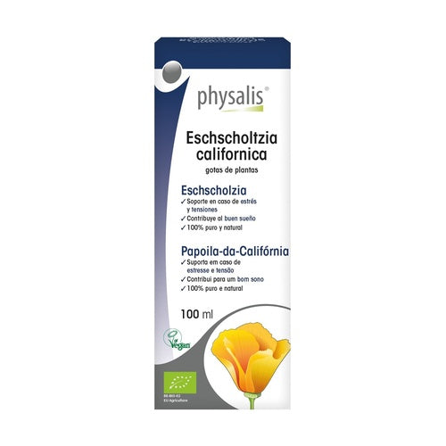 Physalis Eschscholtzia californica gotas de plantas bio apoyan en casos de estrés y tensión. La amapola de California ha sido reconocida por facilitar la relajación natural. Contribuye de forma segura a un buen sueño reparador.