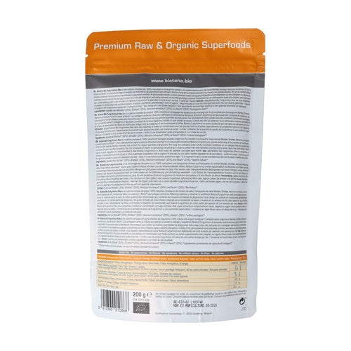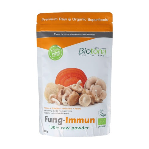 Complemento alimenticio – Biotona bio Fung-Immun Raw es un complejo sublime 100% natural y biológico de setas en polvo. Lo componen los hongos Maitake, Shiitake, Hericium erinaceus (o melena de león), así como Agaricus blazei y Reishi°, que ofrecen protección frente a los factores externos y fortalecen la inmunidad. Además del cuerpo fructífero de estos hongos, que contienen grandes cantidades de polisacáridos (como los beta-glucanos), Biotona bio Fung-Immun contiene el micelio de Cordyceps sinensis. Se recomienda utilizar Biotona Fung-Immun en ciclos cortos de, por ejemplo 5 a 6 días a la semana/3 semanas al mes.