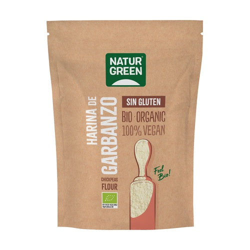 Harina de garbanzo ecológica molida muy rica en fibra, vitaminas y proteína.
