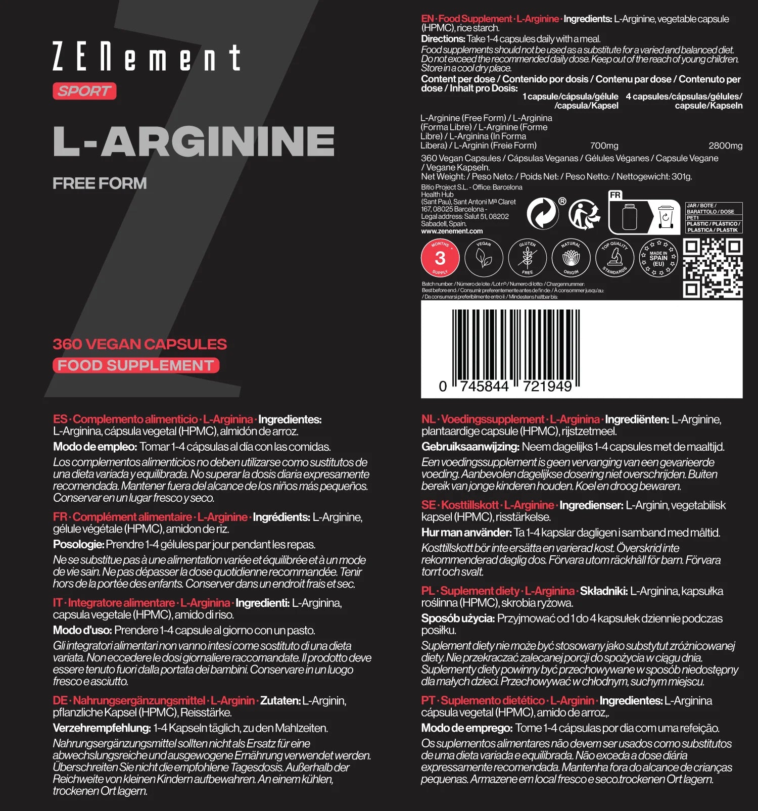 USO VERSÁTIL Y ALTA CONCENTRACIÓN: Este complemento alimenticio aporta 700 mg de L-Arginina en forma libre por cápsula, permitiendo ajustar la dosis diaria hasta un máximo de 2800 mg. Su versatilidad lo convierte en una opción ideal para acompañar una rutina activa, especialmente en etapas de mayor demanda nutricional. El envase incluye 360 cápsulas veganas, lo que proporciona un suministro continuo para hasta tres meses, en función de la dosis diaria utilizada.