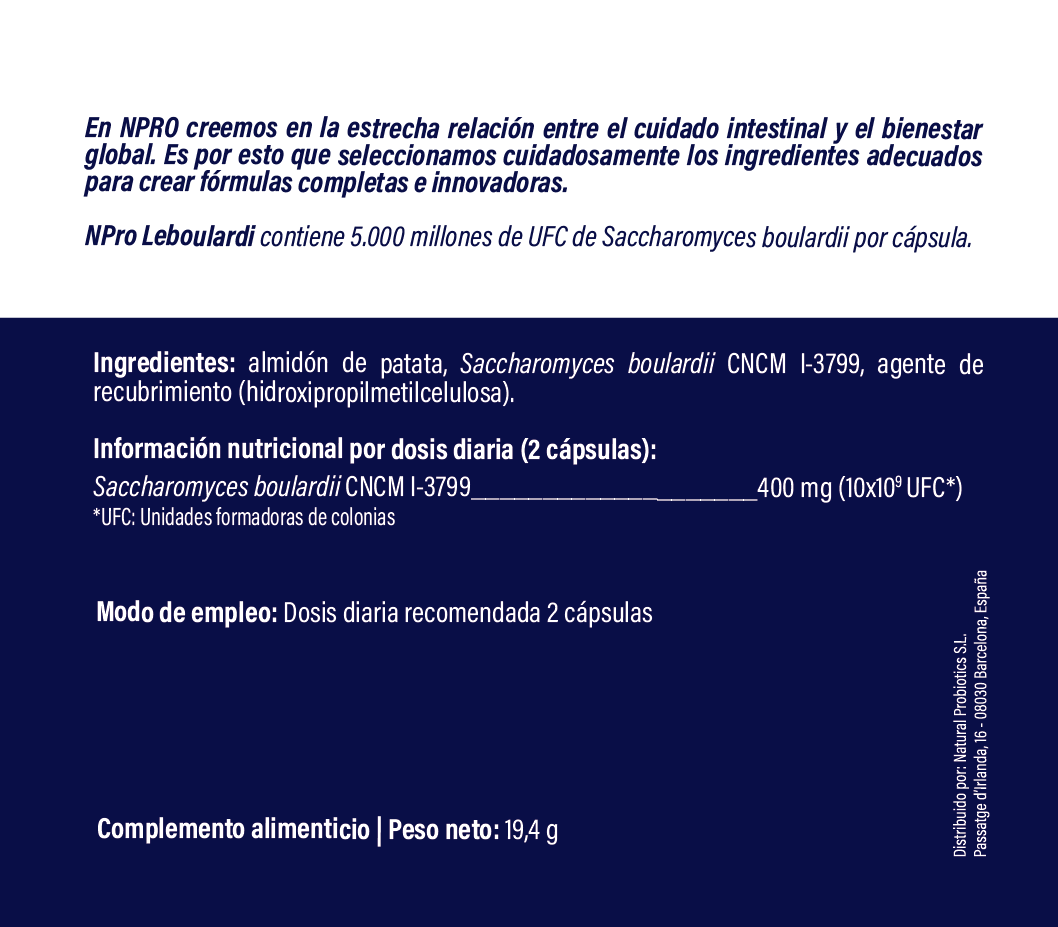NPro Leboulardi combina 5000 millones de UFC de Saccharomyces boulardii CNCM I-3799 con almidón de patata, una fuente de almidón resistente con efecto prebiótico, bajo en FODMAP.