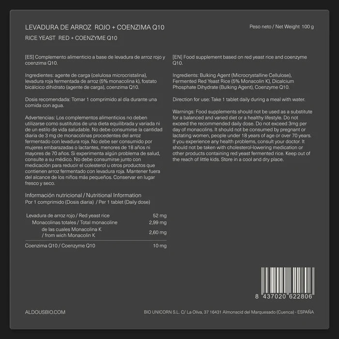 Cuida tu salud cardiovascular con la Levadura de Arroz Rojo con Q10 Aldous. Una formulación avanzada presentada en 400 comprimidos de 2,99 mg de monacolinas para 400 días.