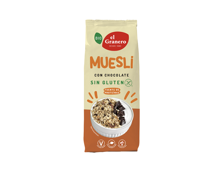 Ingredientes: copos de avena* integral sin gluten 81%, copos de maíz tostado con chocolate negro* 6,5 % (maíz*, pasta de cacao*, azúcar de caña* integral, manteca de cacao*, sal marina), láminas de chocolate negro* 6% (azúcar de caña* integral, pasta de cacao*, manteca de cacao*, emulsionante: lecitina de girasol*), copos de arroz* 4% (arroz*, azúcar de caña* integral, sirope de arroz*, sal marina), y bolitas de maíz con chocolate negro* 2,5% (azúcar de caña* integral, semolina de maíz*, pasta de cacao*, manteca de cacao*, cacao en polvo*, sal marina) cacao* en polvo 0,5%. Puede contener trazas de leche, frutos de cáscara, sésamo, mostaza, altramuces y soja.
