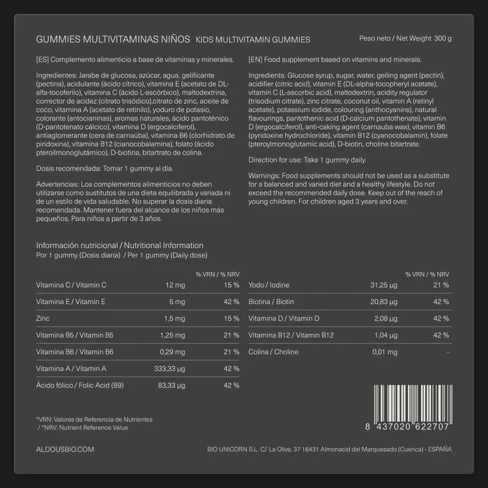 Las Multivitaminas para niños en gominolas Aldous son las vitaminas que a tus hijos no les costará tomar. Una formulación avanzada con nueve vitaminas y minerales presentada en 120 gummies para 120 días.