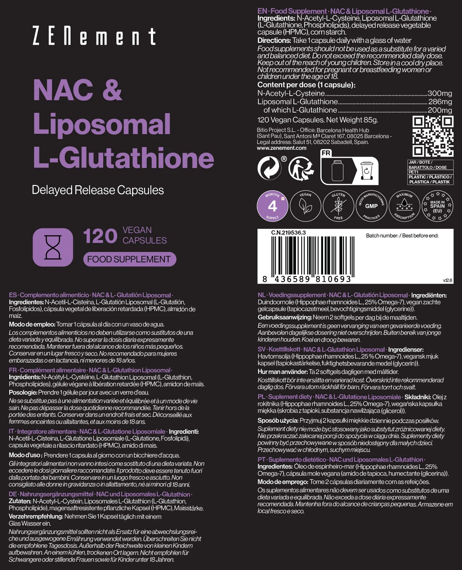 Contenido por dosis (1 cápsula): N-Acetil-L-Cisteína 300 mg, L-Glutatión liposomal 286 mg, de los cuales L-Glutatión 200 mg. Otros ingredientes: cápsula vegetal de liberación retardada (HPMC), almidón de maíz.