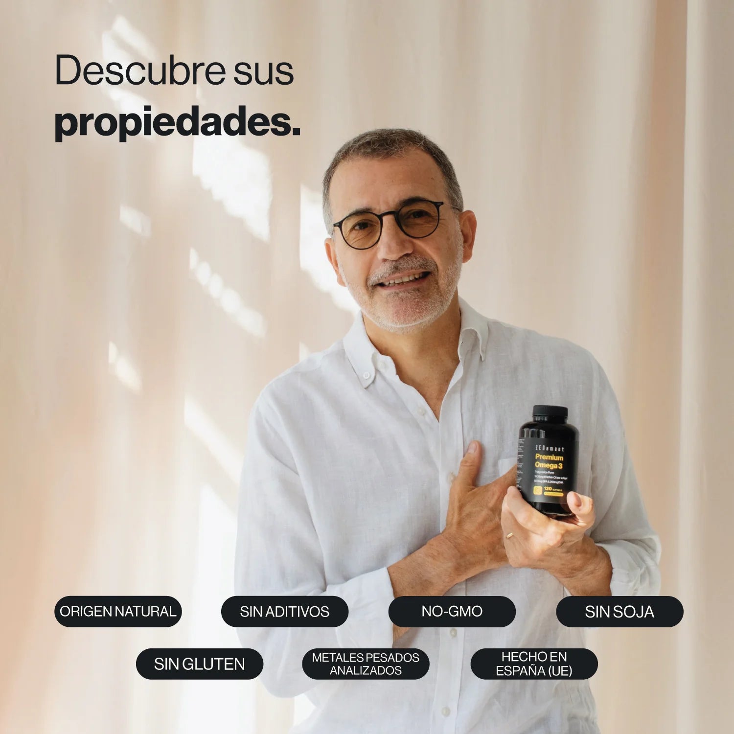 ALTOS NIVELES DE EPA (1000 MG) Y DHA (500 MG) POR DOSIS (2 CÁPSULAS): Los ácidos grasos EPA y DHA son esenciales para mantener la función cerebral y la visión normales, además de contribuir a mantener niveles saludables de triglicéridos en la sangre. Nuestro Omega-3 Premium también incluye vitamina E para preservar las propiedades del aceite de pescado, ofreciendo un suplemento completo y equilibrado.