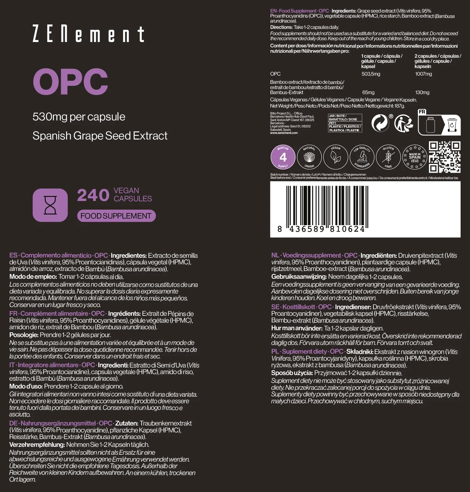 Ingredientes por dosis (2 cápsulas): OPC 1050 mg (de Extracto de Semilla de Uva, 99% Proantocianidinas). Otros ingredientes: almidón de arroz, antiaglomerante (extracto de Bambú, Bambusa arundinacea, 75% sílice), cápsula vegetal (HPMC).