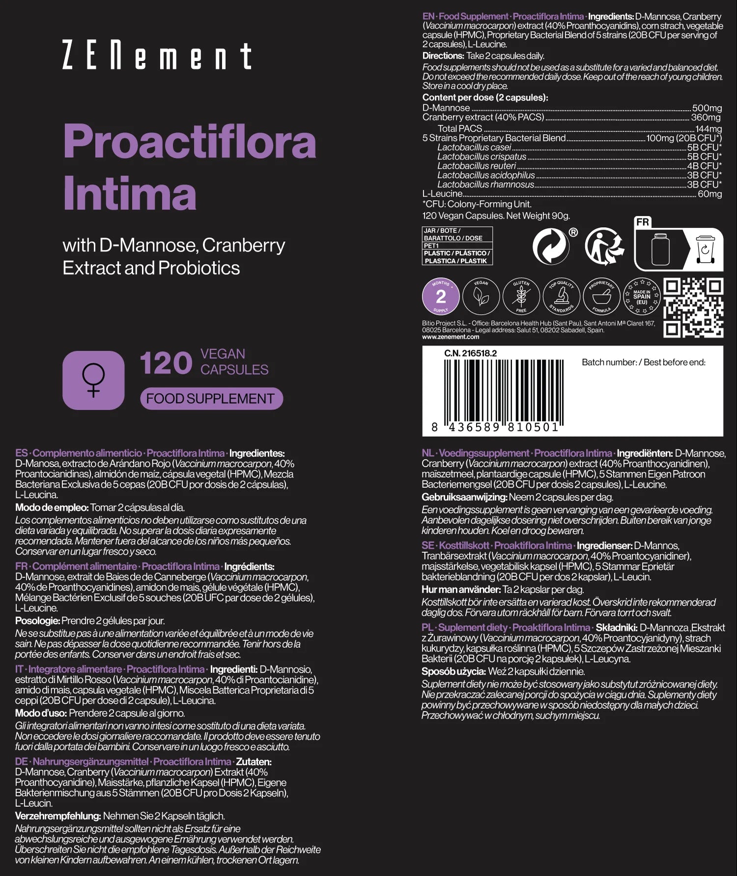 Ingredientes por dosis (2 cápsulas): D-Manosa 500 mg, extracto de Arándano Rojo (Vaccinium macrocarpon) 360 mg (aporta 144 mg de PACS), Mezcla Bacteriana Exclusiva de 5 cepas (20*1E9 UFC por dosis) 100 mg: Lactobacillus casei 5*1E9 UFC, Lactobacillus crispatus 5*1E9 UFC, Lactobacillus reuteri 4*1E9 UFC, Lactobacillus acidophilus 3*1E9 UFC, Lactobacillus rhamnosus 3*1E9 UFC, L-Leucina 60 mg. Otros ingredientes: antiaglomerante (almidón de maíz), cápsula vegetal de liberación retardada (HPMC, pectina). *UFC: Unidades Formadoras de Colonias.