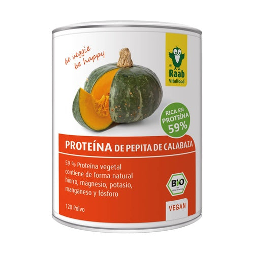 La proteína de pepita de calabaza Bio de Raab se consigue a través del desengrasado y molido de las pepitas y destaca por su fi no y típico aroma. Es especialmente indicada para añadir tanto en comidas y bebidas dulces como saladas o como complementación de smoothies, mueslies, postres y pastelería. La proteína de pepita de calabaza tiene un alto contenido en ácidos grasos insaturados. Además es rica en magnesio y contiene 59 % de proteína de alta calidad. El magnesio contribuye a una función normal del sistema nervioso y muscular. Además contribuye a la conservación normal de los huesos y dientes.