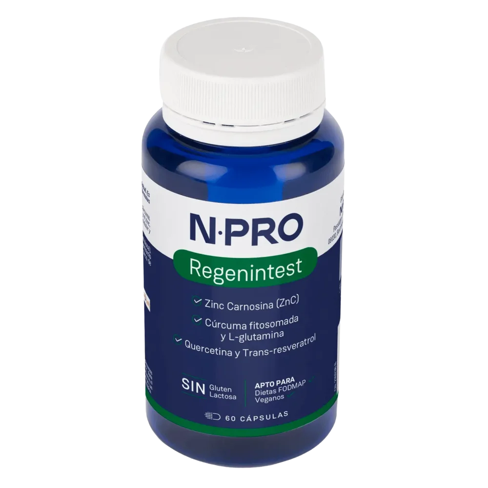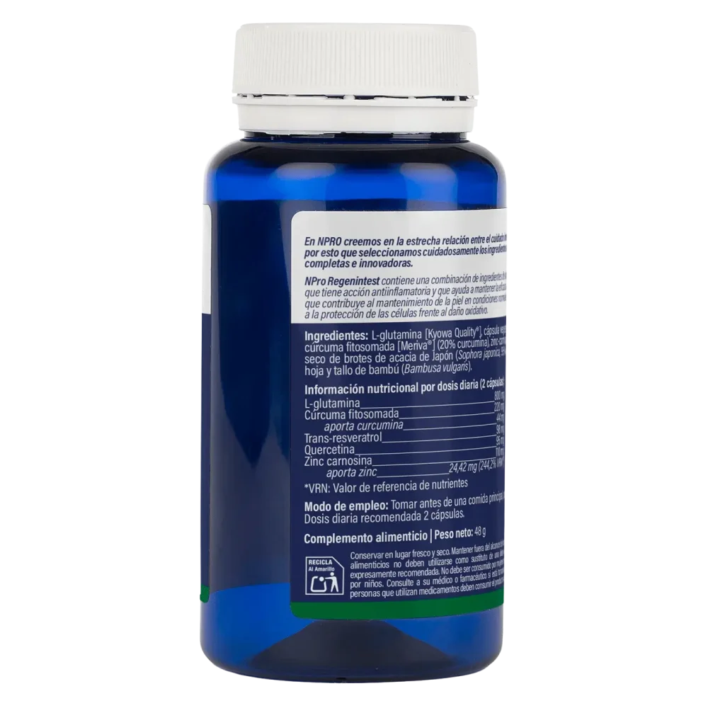 Npro REGENintest tiene una acción regeneradora del epitelio intestinal y de la mucosa. Gracias a su formulación a base de aminoácidos, plantas antinflamatorias y antioxidantes, cuida la barrera intestinal. La sinergia de sus ingredientes refuerza los mecanismos naturales de defensa frente a la degradación de la mucosa.