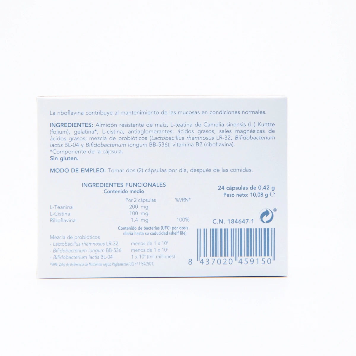 Almidón de maíz; L-teanina; gelatina (cápsula); cistina (L-cistina); mezcla de probióticos (Lactobacillus rhamnosus LR32, Bifidobacterium lactis BL04, Bifidobacterium longum BB536); antiaglomerantes: sales magnésicas de ácidos grasos, dióxido de silicio; vitamina B2 (ribo1flavina);