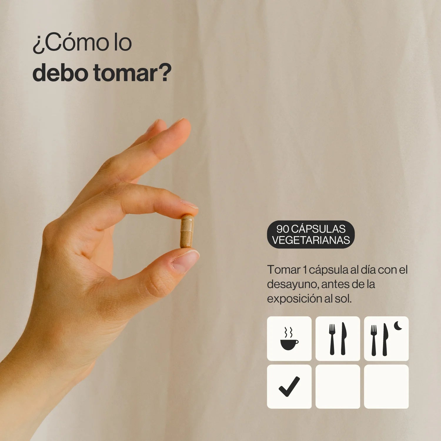 Tomar 1 cápsula al día con el desayuno, antes de la exposición al sol. Se recomienda tomar durante máximo 3 meses, seguido de 2 meses.