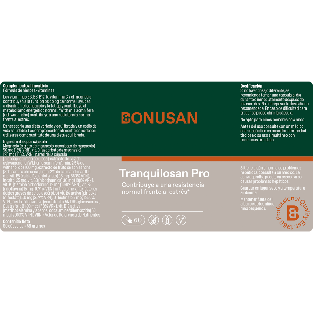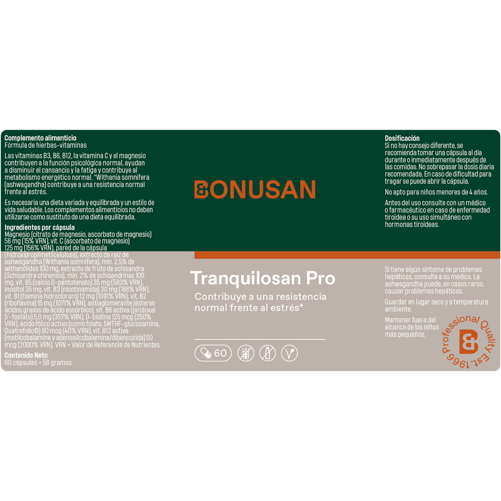 - Contiene el complejo de vitaminas B, bufera (ashwagandha), esquisandra, magnesio y vitamina C