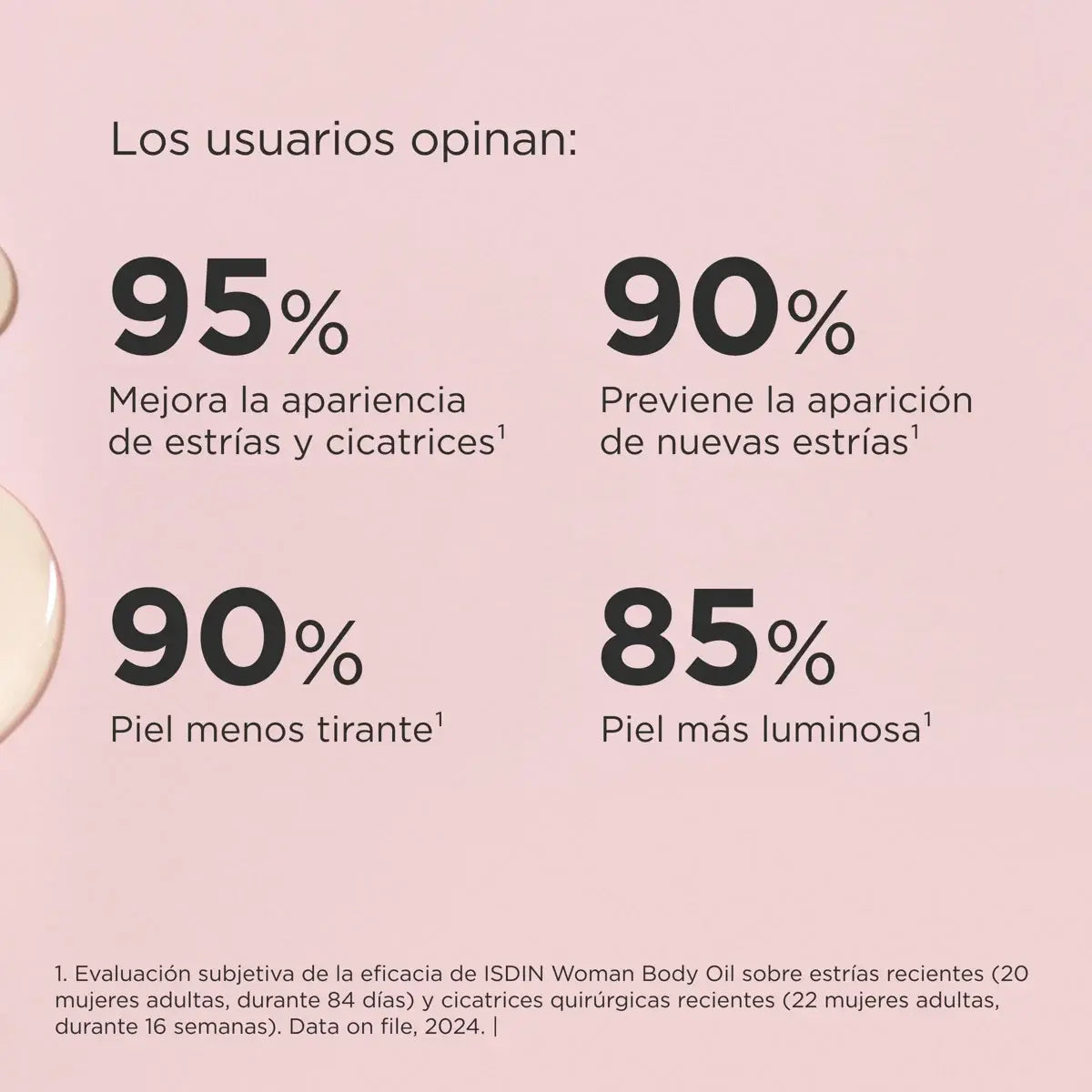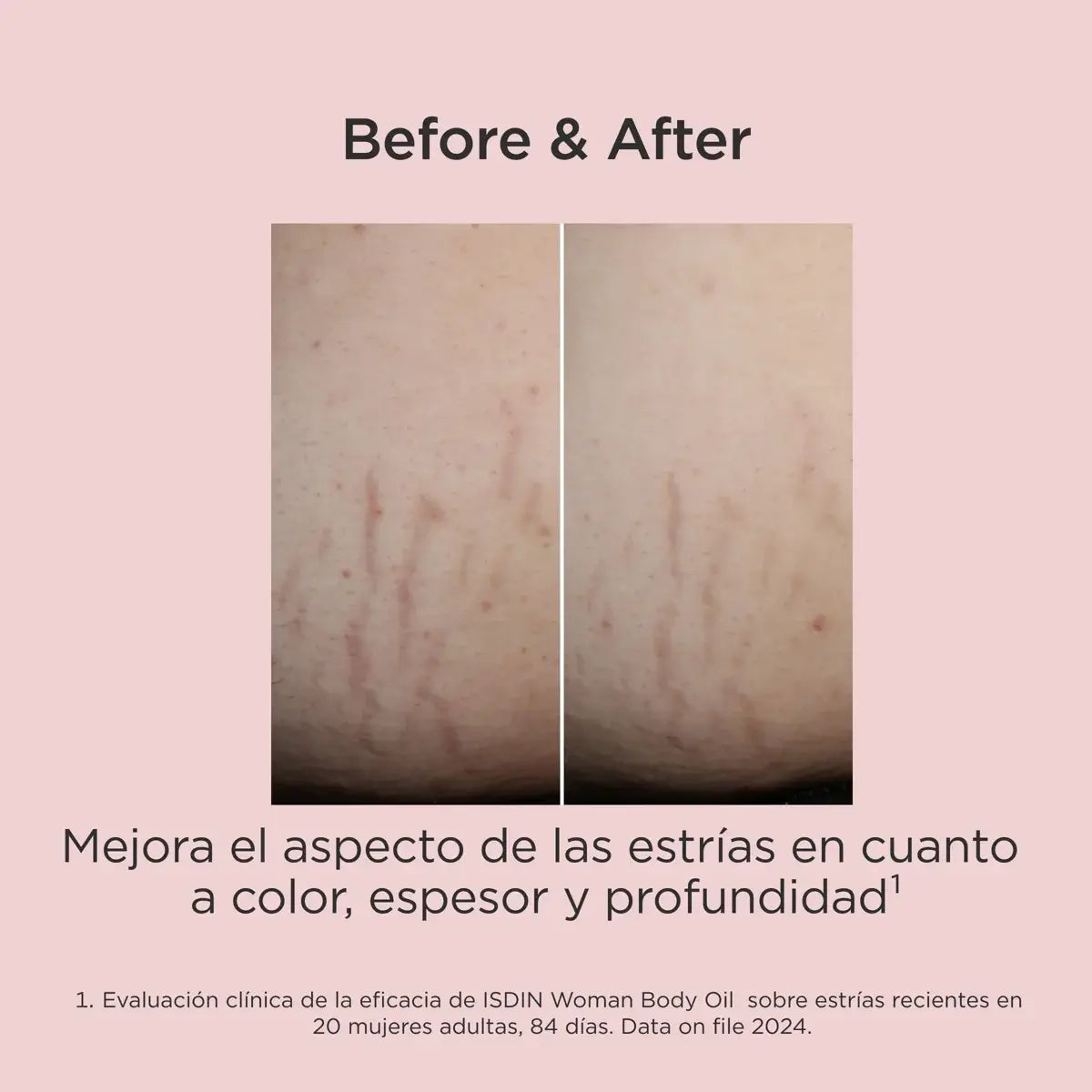 Nutre tu piel en profundidad con ISDIN Woman Body Oil, el aceite corporal con un 92% de ingredientes de origen natural que mejora la firmeza de la piel tras un mes de uso¹. Previene la aparición de estrías y reduce el aspecto de estrías y cicatrices para una piel visiblemente más luminosa.